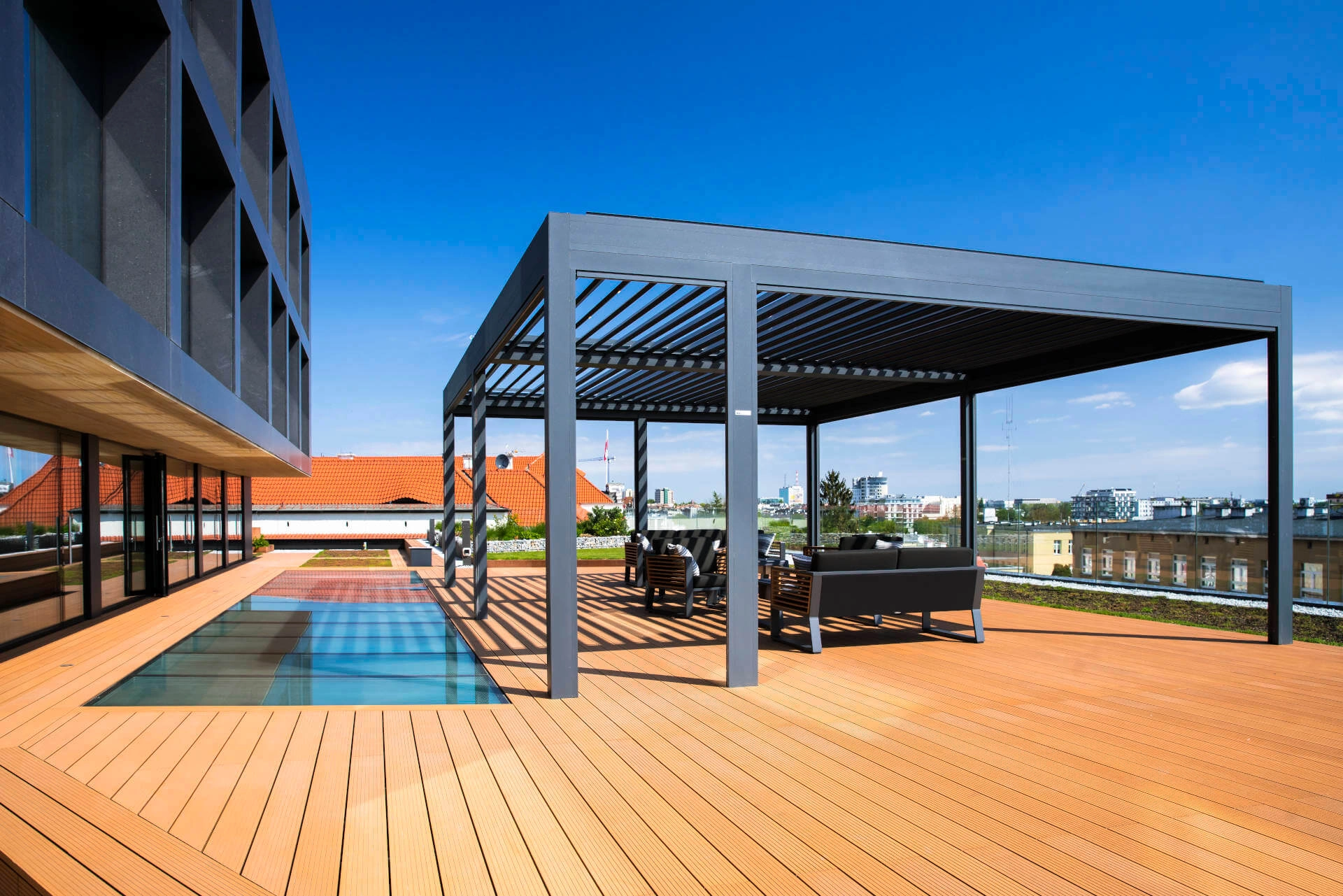 A Sun-Set pergolái természetesen nem csak egyénileg, magáncélra használhatók. Ideális lehet a rugalmas térfedéshez a szabadtéri vendéglátásban, legyen szó szálloda belső udvaráról, étterem teraszáról vagy egy kávézó utcafronti árusításáról. Csúcskategóriás pergolánk lehetővé teszi a vendéglátó terület bővítését és ezzel a forgalom növekedését is, mert az időjárástól teljesen függetlenül üzemeltetheti teraszát.